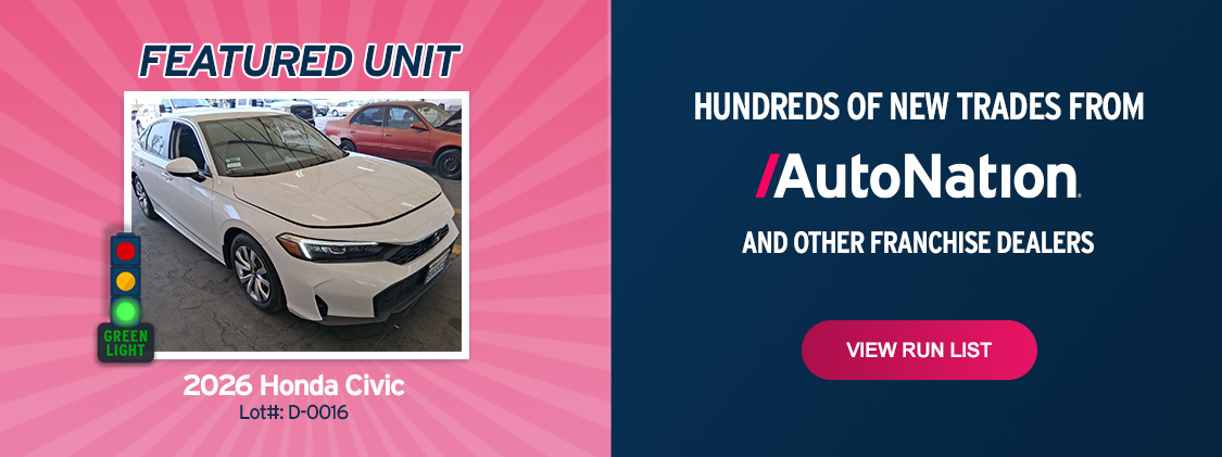 AutoNation Auto Auction Los Angeles is a dealer-only auto auction, and the premiere source of vehicles for wholesale buyers in Southern California. We are the EXCLUSIVE home to all of AutoNation's Western Region dealership's trades (Southern/Northern California, Nevada, Arizona & Washington). We also feature fresh trades from the new car franchise dealerships, fleet/lease units from exclusive AutoNation Finance Repos, Flexco & much more. We offer our buyers an outstanding selection of cars each & every week!